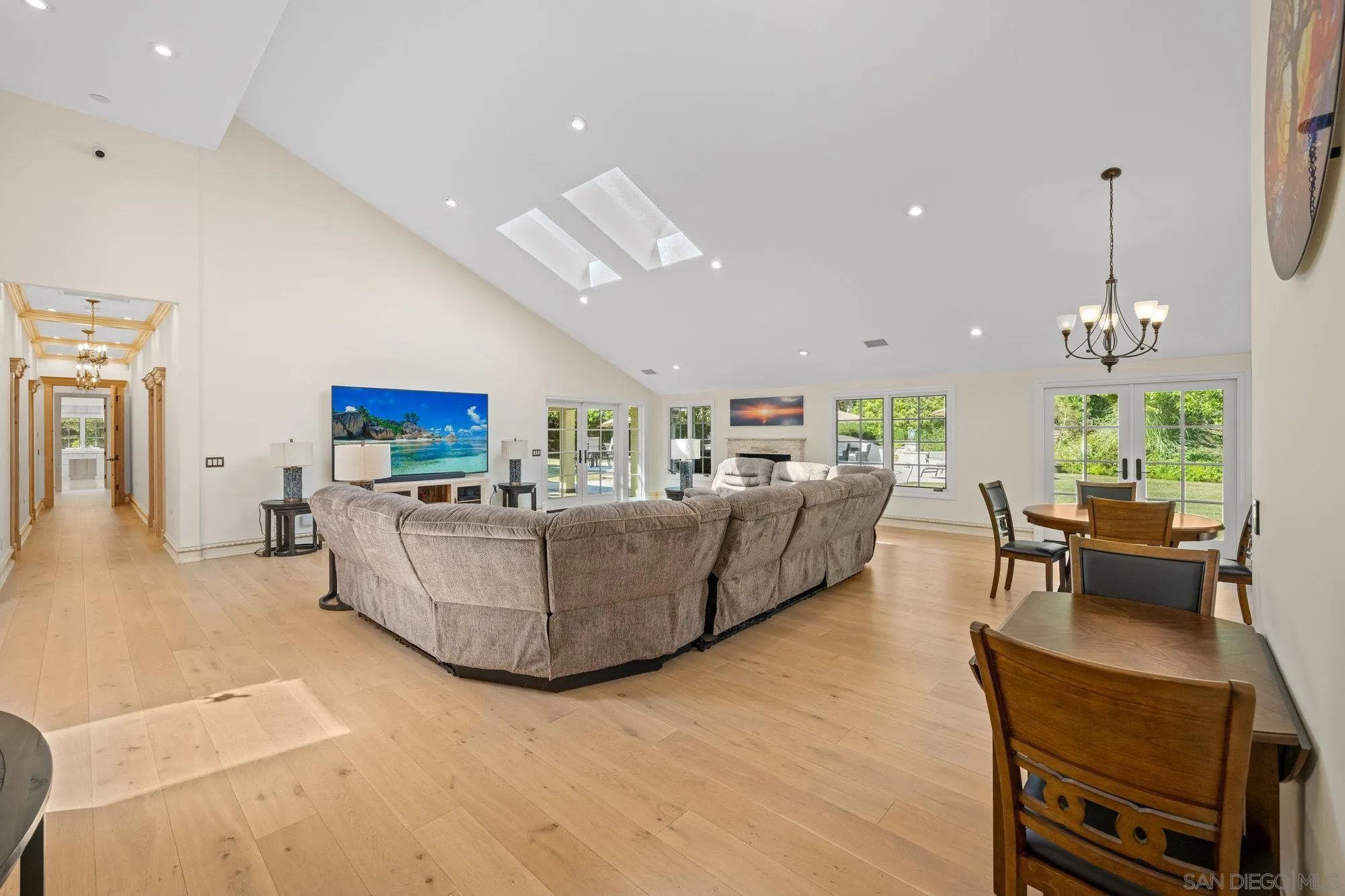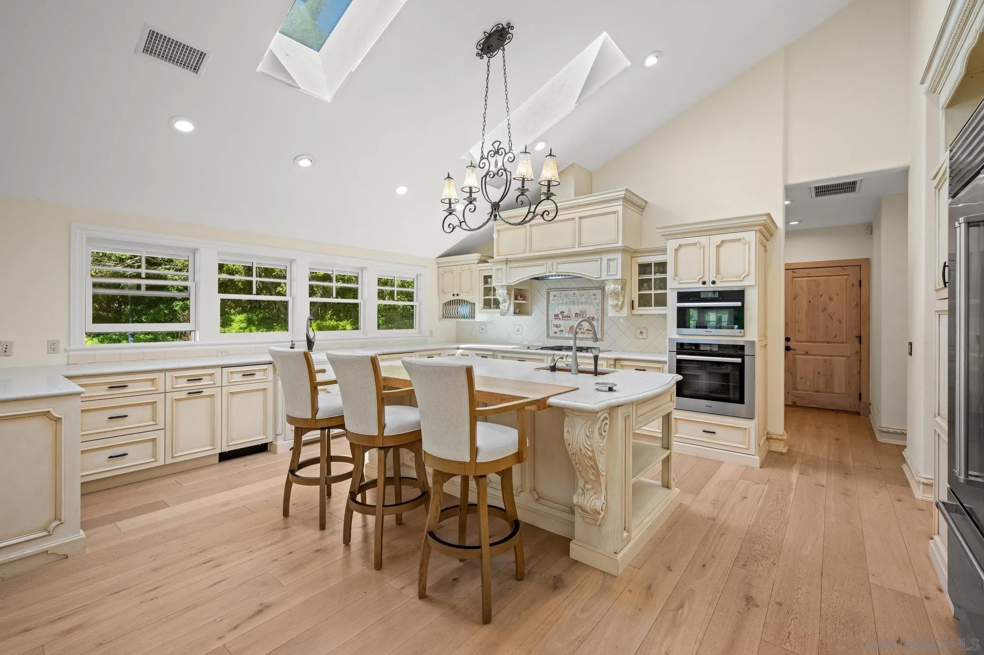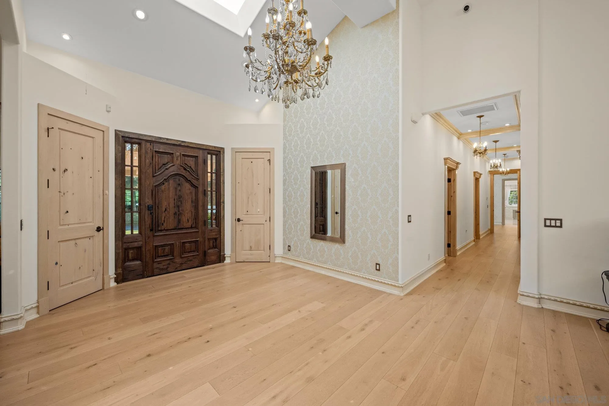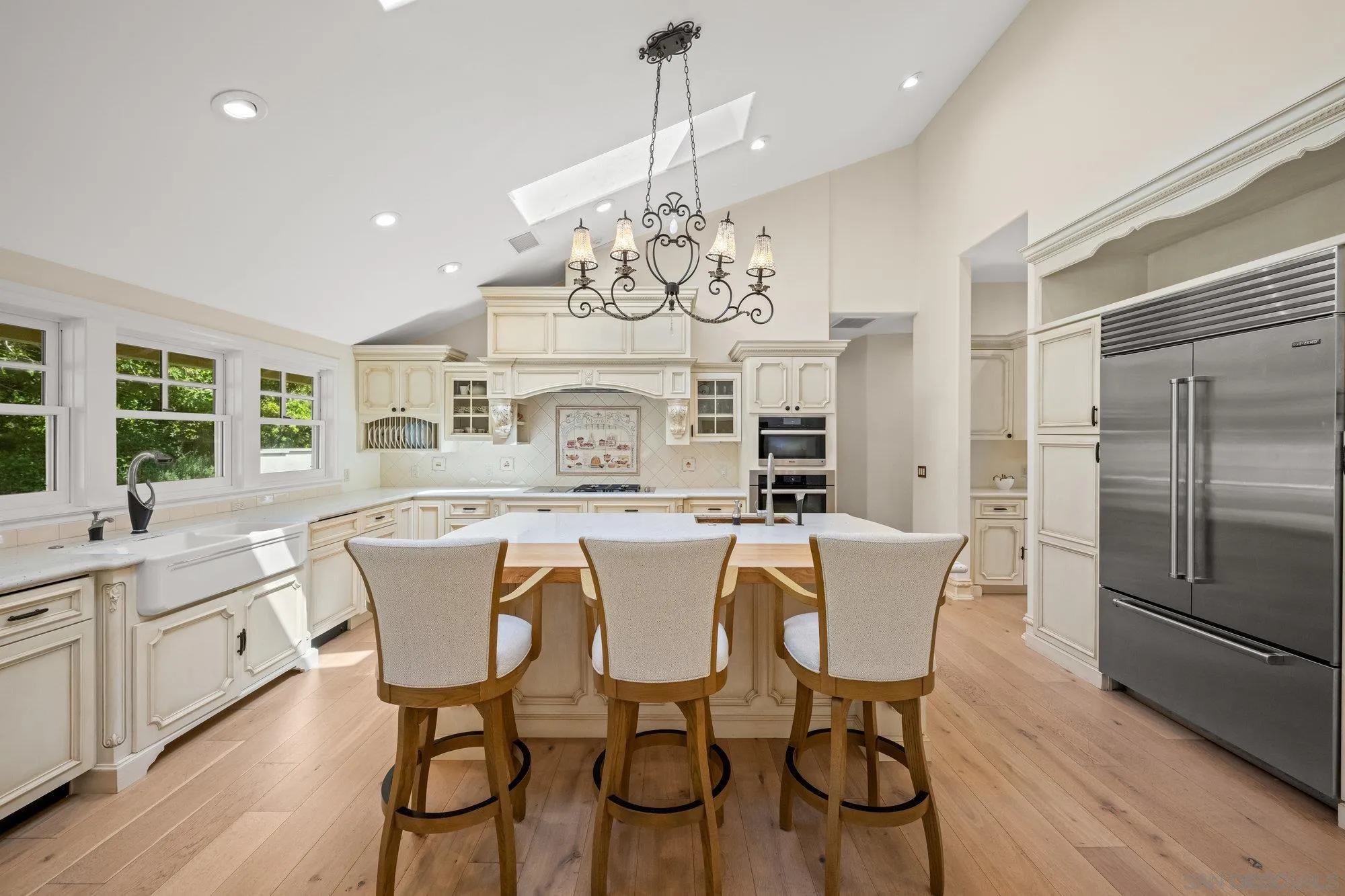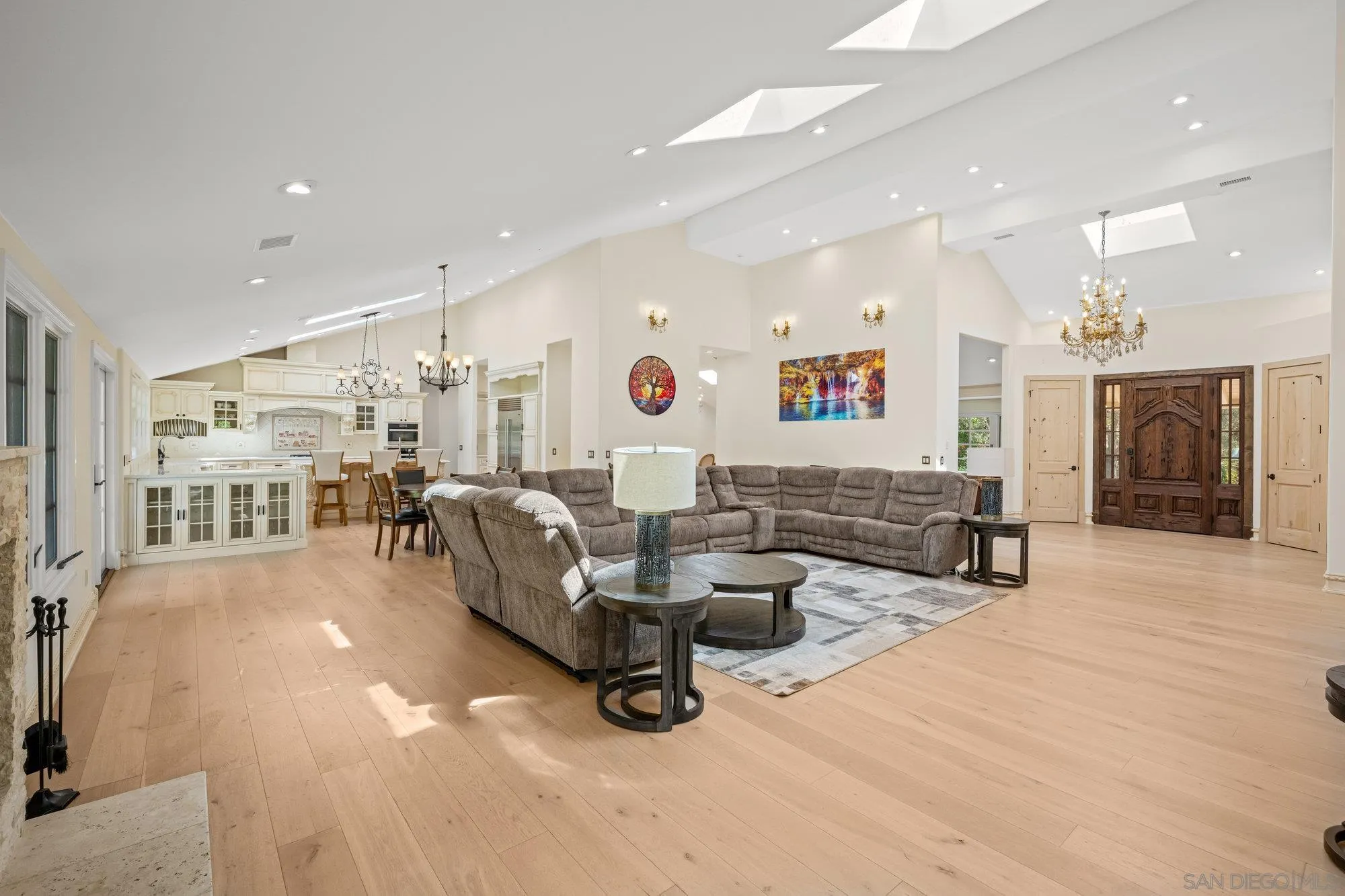 Experience elevated one-level living on 2.75 ultra-private, flat acres in Rancho Santa Fe's exclusive Covenant. Rebuilt in 2017 with meticulous attention to detail, this 4,550 sq ft custom estate blends timeless European design with modern California ease. The open-concept floor plan features 5 en suite bedrooms and 5.5 baths, soaring ceilings, and expansive living spaces filled with natural light. The chef's kitchen is a true centerpiece, showcasing sleek European cabinetry, top-of-the-line Miele appliances including dual cooktops and warming drawer, plus whole-home water filtration. A formal dining space and stone-clad fireplace anchor the seamless transition to the elegant family room, creating an inviting space for both entertaining and everyday living. Curated with designer stonework, custom fireplaces, and smart home features--including integrated speakers and security cameras--this home offers effortless sophistication. Outside, enjoy lush landscaping, a sparkling pool and spa, covered patio, and ample parking for up to 18 vehicles. A separate dog wash station with private access adds thoughtful convenience. Located on the desirable west side of the Covenant, minutes from Roger Rowe School, RSF Golf & Tennis Clubs, and village amenities. This is Rancho Santa Fe luxury at its finest--single-level, serene, and simply exceptional.