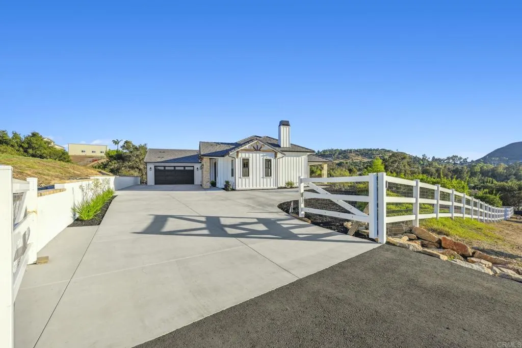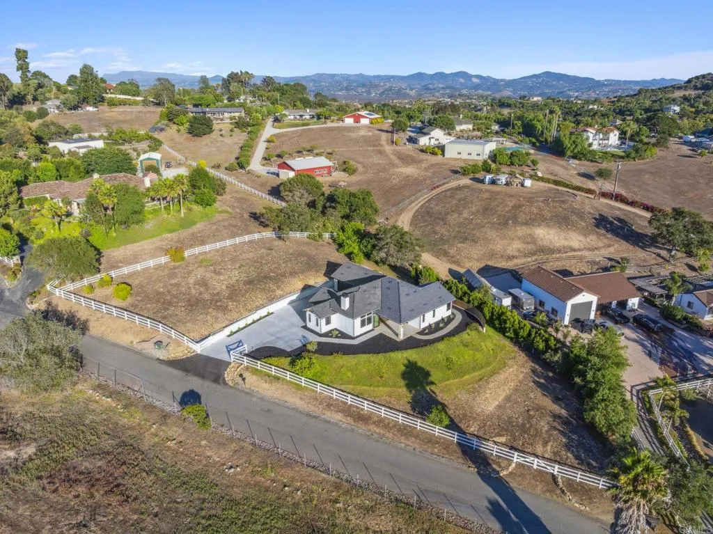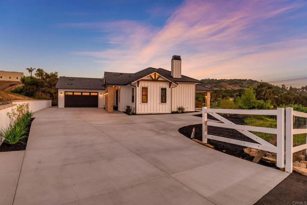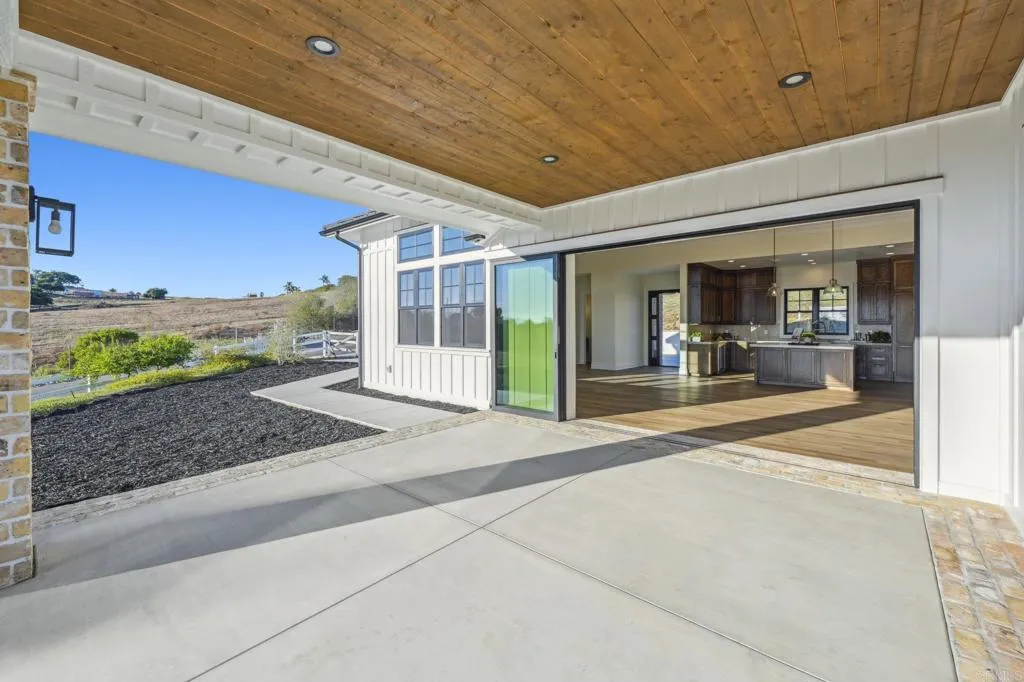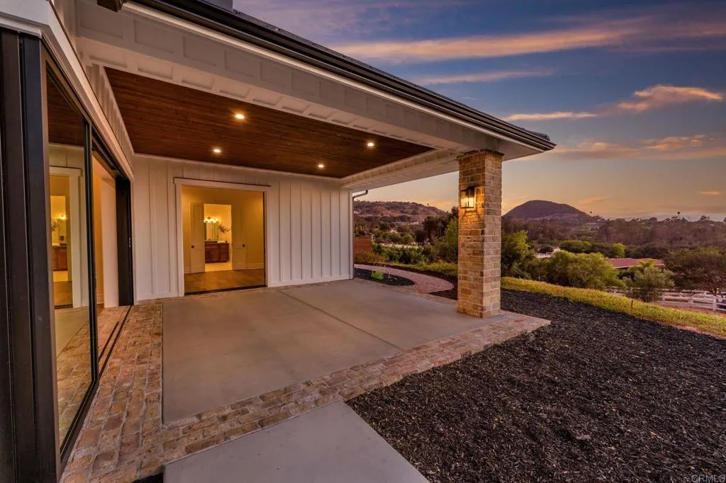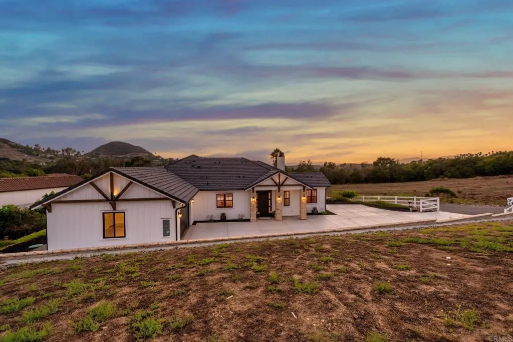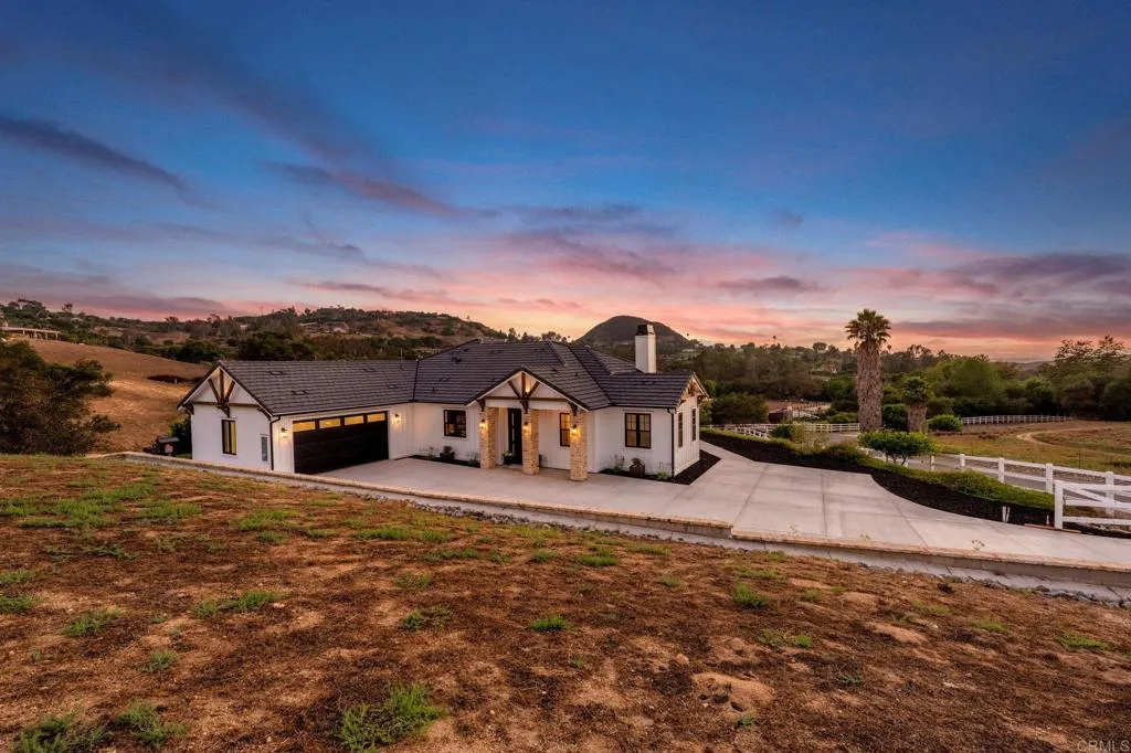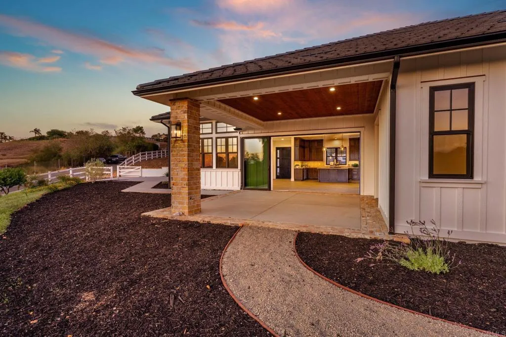 Brand new custom one level home located in the coveted Morro Hills area of Fallbrook. Volume ceilings with crown molding, cantina disappearing doors to covered brick laced patio, high end brushed bronze fixtures, quartzite counters and many designer touches. Top quality built in custom cabinetry throughout the home. Fully fenced parcel and room for RV or boat parking. Zoned for horses, chickens and any 4-h projects you may want. Enjoy the dramatic sunset vistas setting over the treetops and the cooling ocean breeze from your large covered patio adjoining the great room and primary bedroom suite. With uncompromising quality you will notice upon entering this special home, you will not want to miss this opportunity. Plan your private tour today!